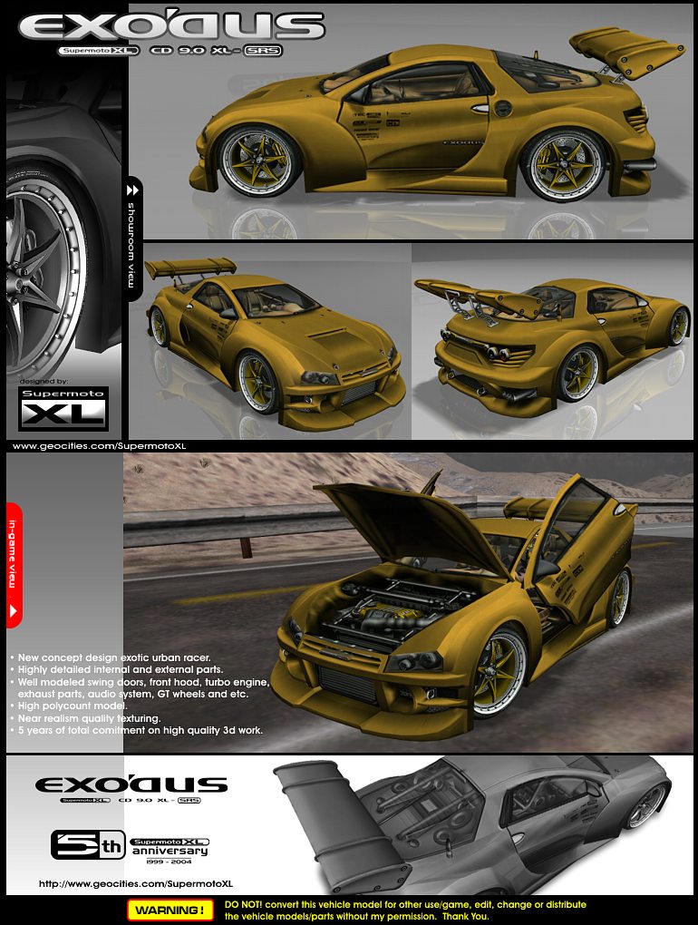 General info | model: EXODUS CD 9.0 XL-SRS | original release plan: race simulation | original release genre: game | 3d tool: Z-modeler | texture tools: Corel Photopaint | original date release: 22-1-2005 | last Updated: --
