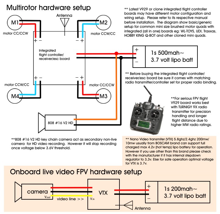 Its not difficult to install FPV hardware into this little bug. Just remove all that not necessary needed to keep overall "super lightweight", keep the wires short and thin and solder with little blob to the connection. The FPV hardware are extremely basic: just a nano camera and nano size video transmitter (1.2/2.4/5.8ghz) powered from separate single micro lipo pack 150mah 1s. A good build will give you a perfect total flying weight of below 70 gram. If you're planning to do some aerial video/photography a totally naked/stripped 808 #16 V2 HD key-chain can be stick under the belly with total flying weight of 78 gram. You'll need to be creative to custom made a soft landing gear to handle rough landing. Some thin looped zip ties under the gear cage will do the job to spring dampen any harsh landings. If you intend to use GWS 5443 propellers make sure you properly balance it per-blade tips using small thin sticky tape bit by bits until the vibration from the camera is at minimal to avoid shakiness during HD recording. Stock V929 blades seldom have problem with vibration but the blades doesn't handle well with high outdoor winds. For beginners flight its best to fit camera with 120 to 150 degree interchangeable lenses which commonly available for 1/3 mini sized 520TVL CMOS cam for better wide angle viewing when maneuver among obstacles such as trees and corridors, but the drawback is weight. Once progress you've improve flight skills you can downgrade to "nano" size camera 520TVL 90 degree lens which offer improve weight and increase performance and flight-time of V929 with discounted ability of wide angle viewing. Most mini/nano cameras comes with internally build microphone and extra audio wire