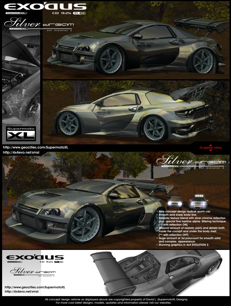 The road bully is back again with all new stunning feature and heart pounding graphics. This is second revision of EXODUS, Fans of EVO1 will be impress and stunned with EXODUS featured in EVO2. This model have major updates on 3d meshes and improvement on texture itself. The 3d faces/edges have been partitioned to properly deflect the vertex shading and lighting in the sim environment. In second edition vehicle color available in dark grey body and grey satin wheel with short wheel spindle to harmonized with its silvery theme. The "SILVER DREAM" edition will bring EXODUS back to life as the drivable "silver jewel" of the road. Just like its brother XENO 2, it also have special layer of texture channel to filter out over-chrome effect, the results: high polished silver chrome street warrior without degrading body contour, shades and texture patterns. heavy bump-mapping texture work and detailed alpha channeling layer ensure that you get the most out of EXODUS appearance and your computer graphics capability.