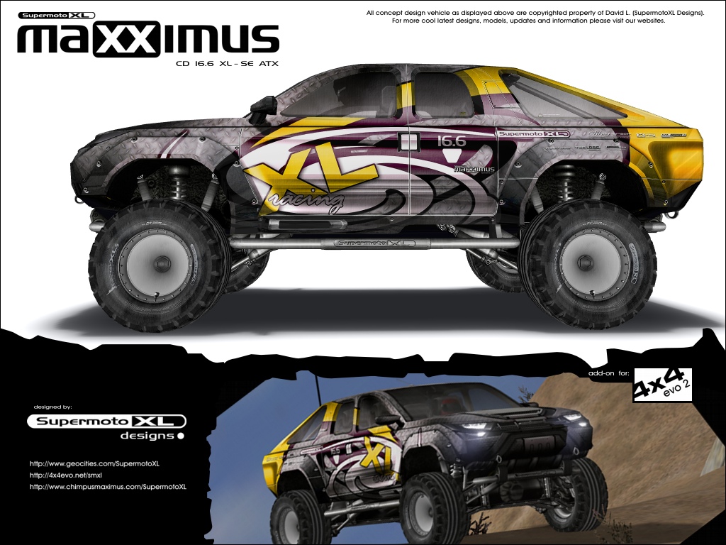 General info | models: MAXXIMUS CD 16.6 XL-SE ATX | platform: PC / Mac (e2) | version: 4x4 evo2 | class: Career | default access in game: NISSAN | avg file size: 5.28MB (evo2) | date released: 5-Mar-2008 | last updated: 7-Mar-2008 (fix invisible wheels problem on open-GL front end graphic mode.)