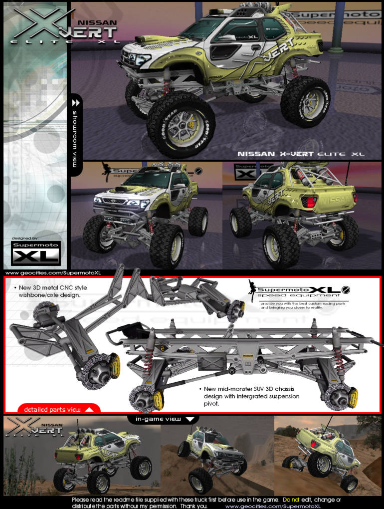 The most successful and well designed truck that pushes 3d details and innovation to the max: "NISSAN X-VERT Elite XL. The details are far beyond gamers imagination with well detailed rendered parts, shocks, suspension, axle, rims and etc. Uses same design methodology after the success of my previous design "FORD XF-150". Axle/suspension movements flex more and handling are more on realism feeling. Takes about approx 45 days complete the whole parts design. Enjoy and take this ride into a whole new world of 4x4!