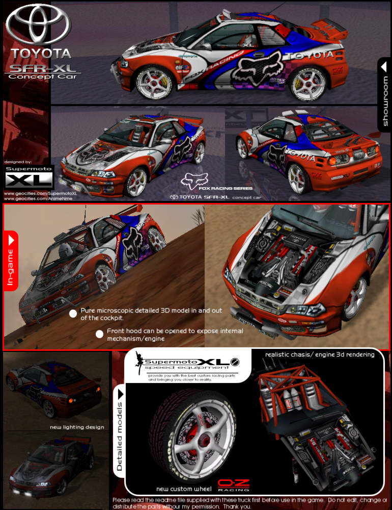 General info | models: Toyota SFR-XL Concept Car | platform: PC / Mac (e2) | version: 4x4 evo 1 & 2 | class: Career | default access in game: TOYOTA | file size: 775kb (evo1) , 1,327kb (evo2) | date released: 8-9-2002 | last updated: 1-11-2002 (fix disc brake "pop-out fix"