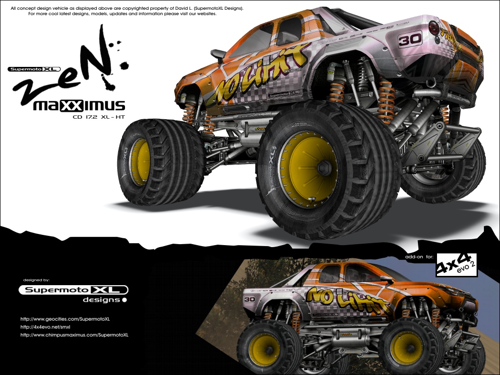 General info | models: ZEN MAXXIMUS CD 17.2 XL-HT | platform: PC / Mac (e2) | version: 4x4 evo2 | class: Career | default access in game: NISSAN | avg file size: 6.74MB (evo2) | date released: 5-Mar-2008 | last updated: 7-Mar-2008 (fix invisible wheels problem on open-GL front end graphic mode.)